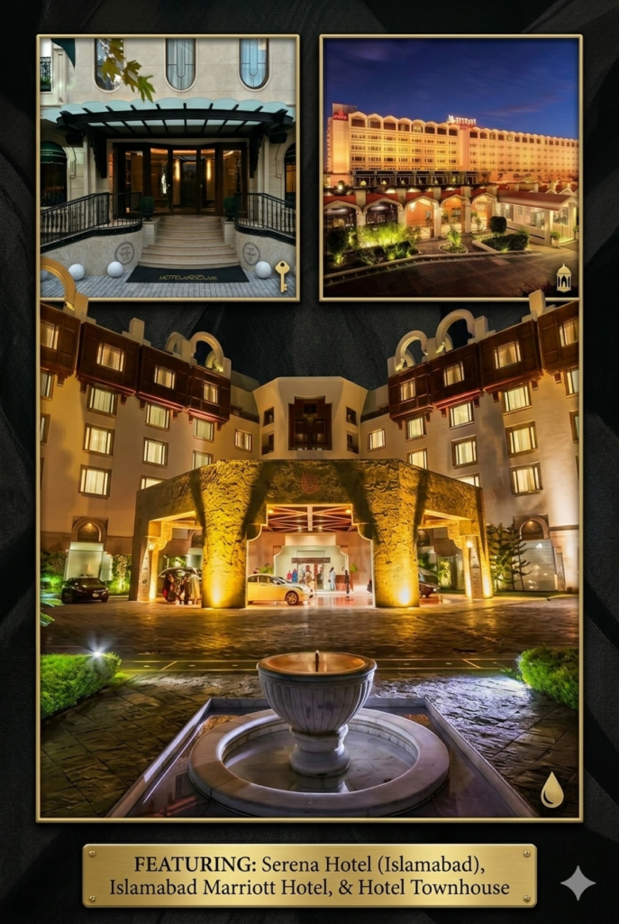 Islamabad Marriott Hotel — Business hotel standard with excellent service, centrally located in the Diplomatic Enclave area. Rates approximately $100 to $180 per night.